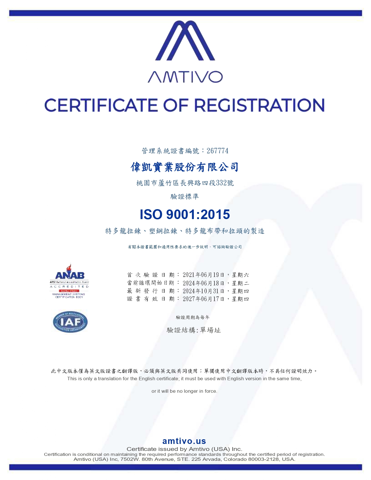 偉凱實業股份有限公司是一家創新公司,我們開發了許多新產品。同時也擁有多項專利並通過了ISO 9001:2015 及OEKO-TEX(環保REACH有害物質限制), 並於2023年通過GRS環保認證